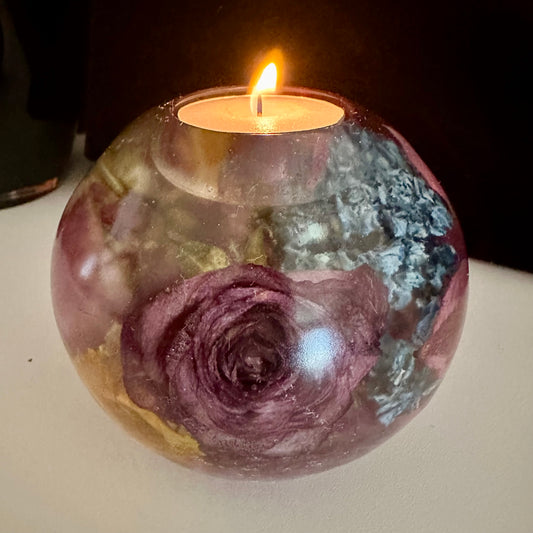 Each candle holder features preserved flowers, thoughtfully treated with premium epoxy resin and specialized drying techniques. This allows the vibrant colors and delicate details of the blooms to shine, making each piece a unique work of art that captures the essence of Bowen Island.