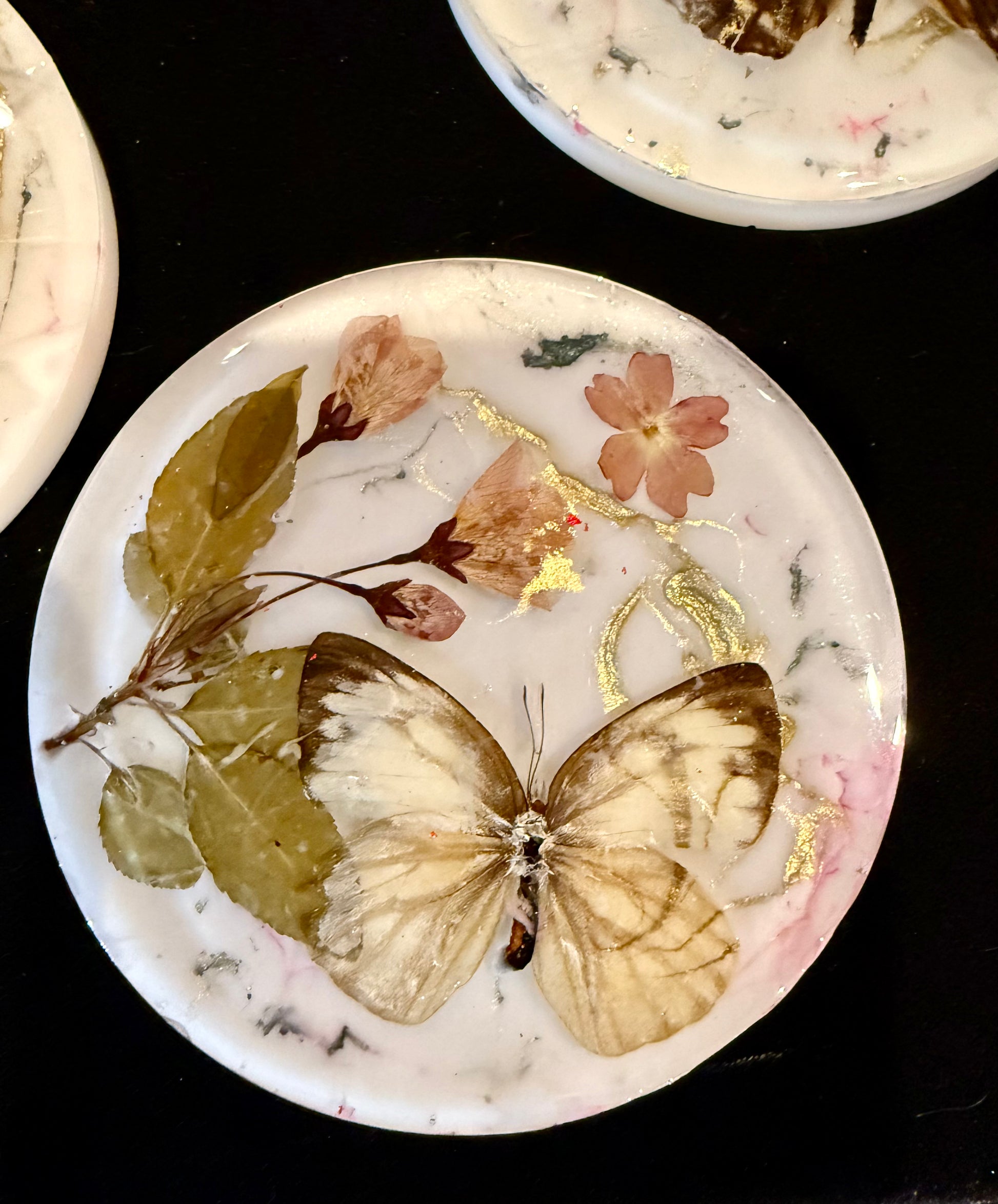 This set of four round resin coasters features two real butterflies, layered with pressed and dried wildflowers gathered from around Bowen Island. Each coaster is hand-poured in crystal-clear resin, finished with subtle glitter and sparkle that catches the light without overpowering the natural details.